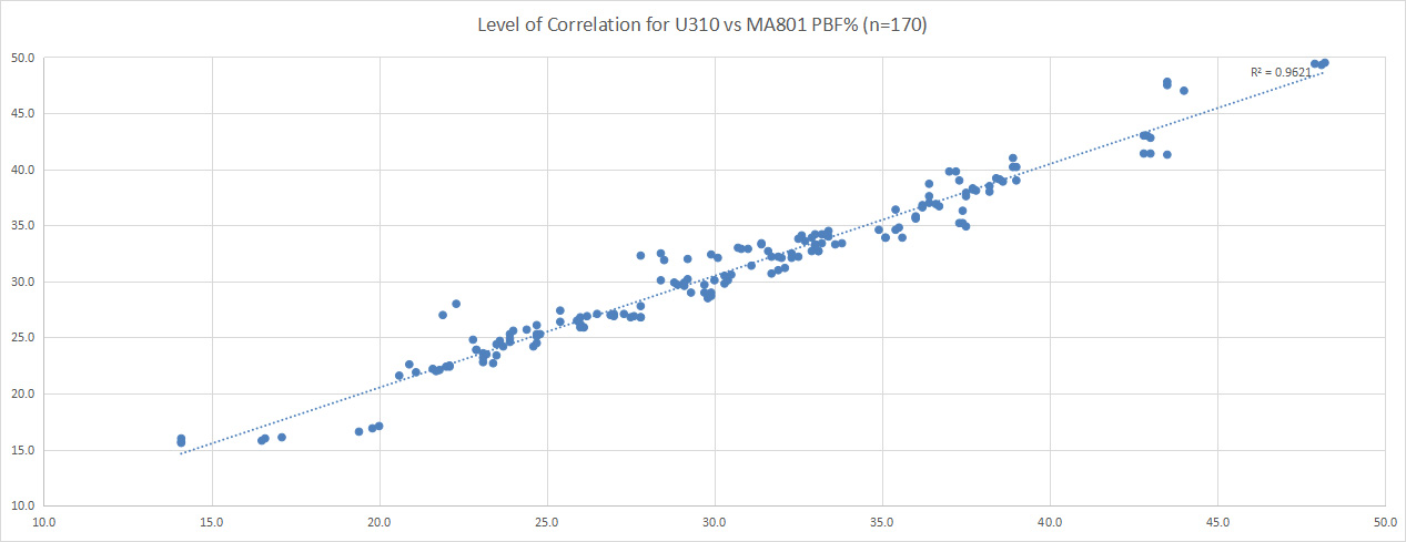 to confirm the validity of measurement outputs, results were compared with those provided by the MA801 Professional Body Composition Analyzer. Bland-Altman analysis for Body Fat Percentage between the two devices calculated a correlation value of r2=0.962, demonstrating high correlation.