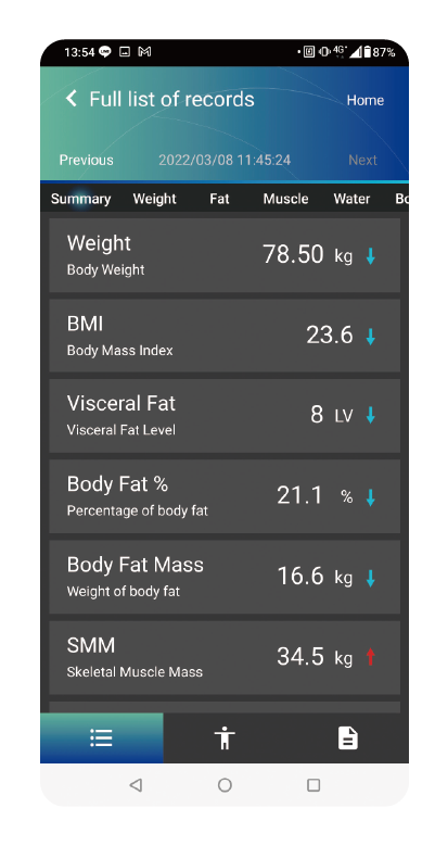 Full body scan will be completed in about 30 seconds, with progress indicated clearly on LCD screen. Results are automatically saved to app after completion, divided into several easy-to-use modules for convenient management and tracking of results!