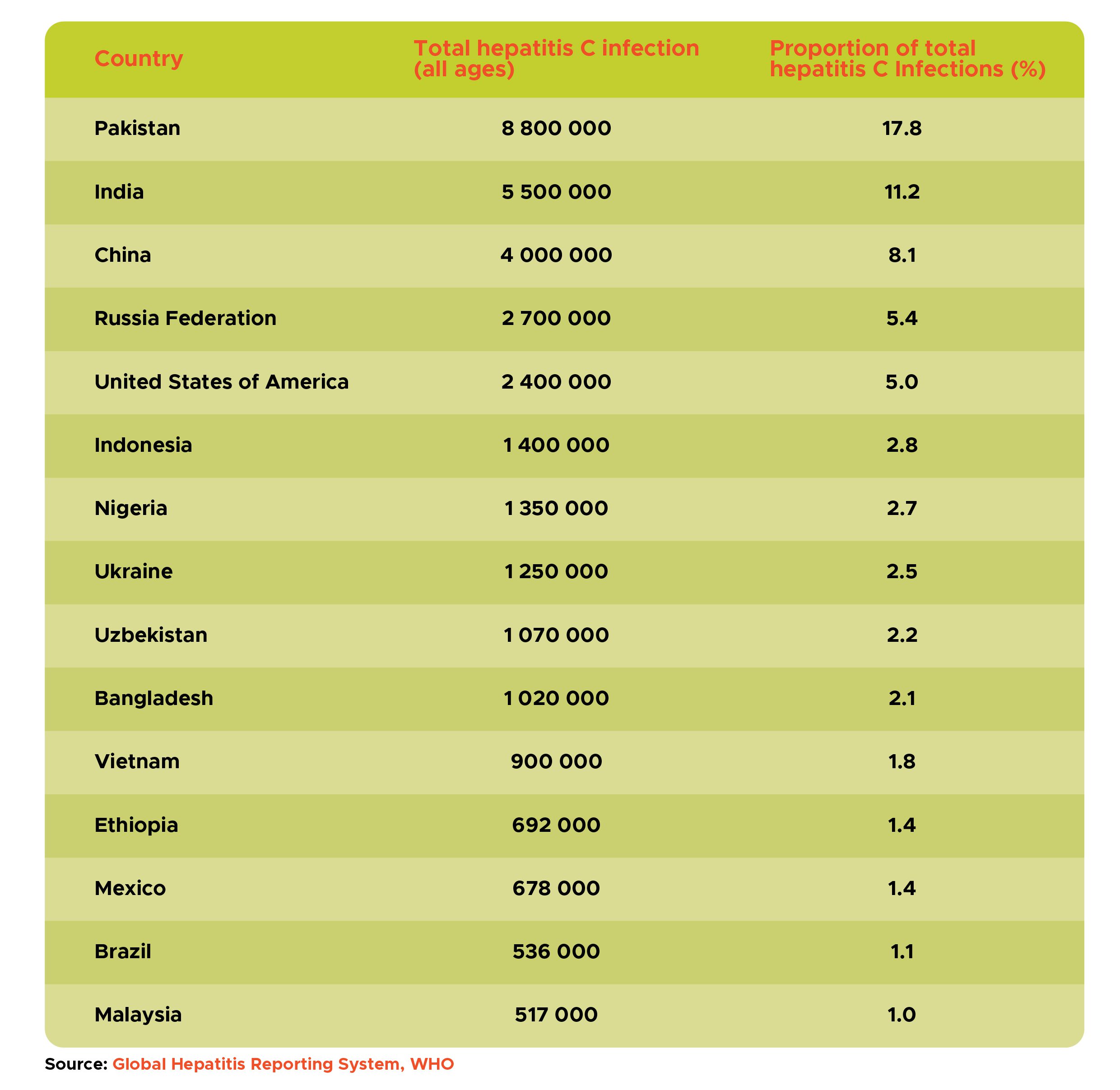 For hepatitis C, six countries – Pakistan, India, China, Russian Federation, United States of America and Indonesia – represent 50% of the global burden; and 15 countries represent about two thirds of the global burden (Table 1).