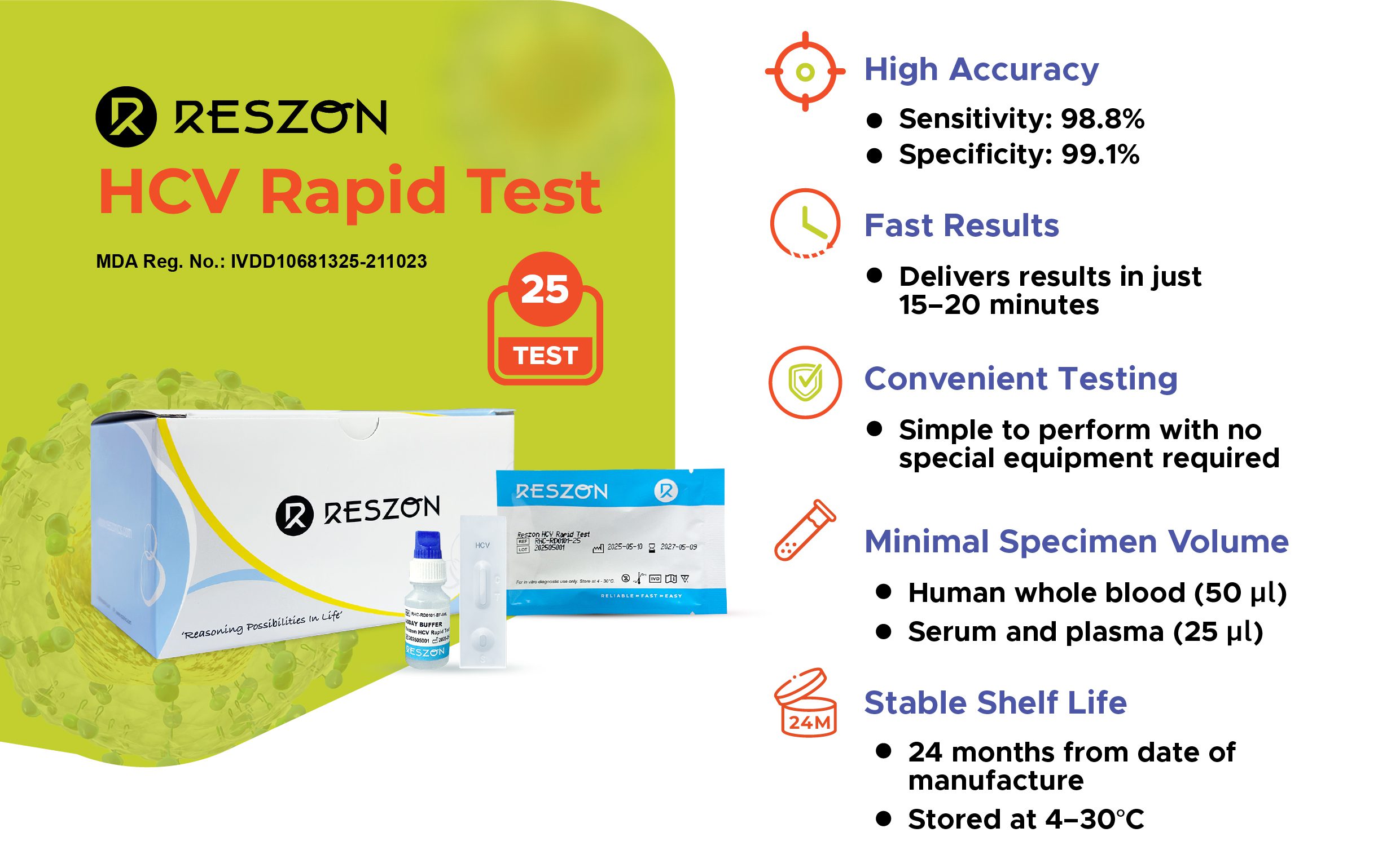 With its ease of use, rapid turnaround time, and reliable performance, the Reszon HCV Rapid Test provides healthcare professionals with a valuable tool for screening and early diagnosis of Hepatitis C, especially in settings where access to laboratory facilities is limited.